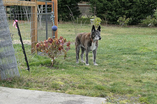 The boys have been congregating under the old blue spruce eating low hanging branches. They're on the alert in case Mistress Hattie enters the pen.